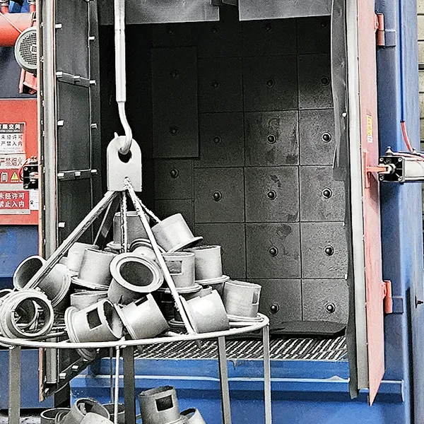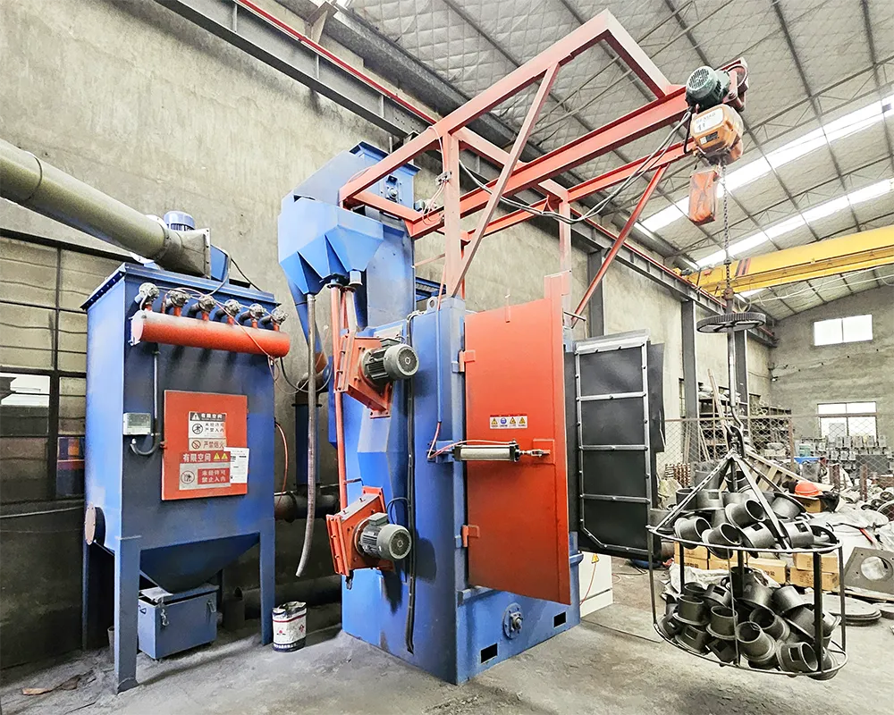 The workpiece is hoisted into the shot blasting room by the hook. After the equipment is started, it automatically rises and falls, rotates and performs multi-angle shot blasting cleaning. After the cleaning is completed, the hook withdraws and the workpiece is unloaded, realizing fully automatic or semi-automatic cycle operation.