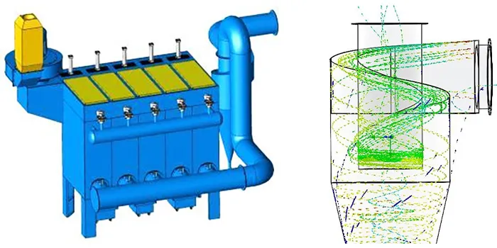 The separator adopts a BE type curtain structure with three-stage separation functions (pure pellets, mixture and sand mixture). The pellet dust mixture is uniformly fed into the separation zone by the feeding screw conveyor, forming a uniform pellet dust flow curtain, and passing through a horizontal airflow of 5-6m/s for pellet dust separation. The pellets and waste materials fall into their respective channels according to their specific gravity, resulting in pure pellets; After falling into the grid and sieving, it enters the hopper for use by the shot blasting machine. Fine dust is sucked into the dust removal system, and the purified gas is discharged into the atmosphere. The particulate dust is captured and collected.