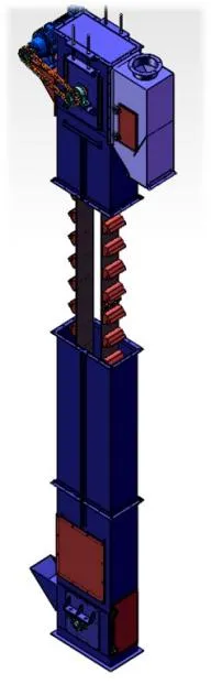 The bucket elevator consists of a cycloidal pinwheel reducer, upper and lower rollers, a conveyor chain, a hopper, a closed casing, and a tensioning device.